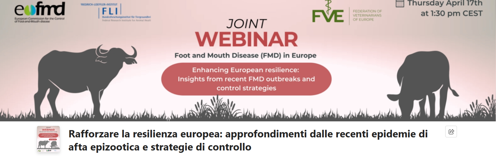 Corsi FNOVI e altri corsi, Formazione, Informazioni per la professione, NewsWebinar “RAFFORZARE LA RESILIENZA EUROPEA: APPROFONDIMENTI DALLE RECENTI EPIDEMIE DI AFTA EPIZOOTICA E STRATEGIE DI CONTROLLO” – 17 aprile 2025 ore 13,30 Pubblicato il 14.04.202517.04.2025 da Segreteria Informazioni e Registrazione al seguente link: Eventi virtuali Microsoft basati su Teams