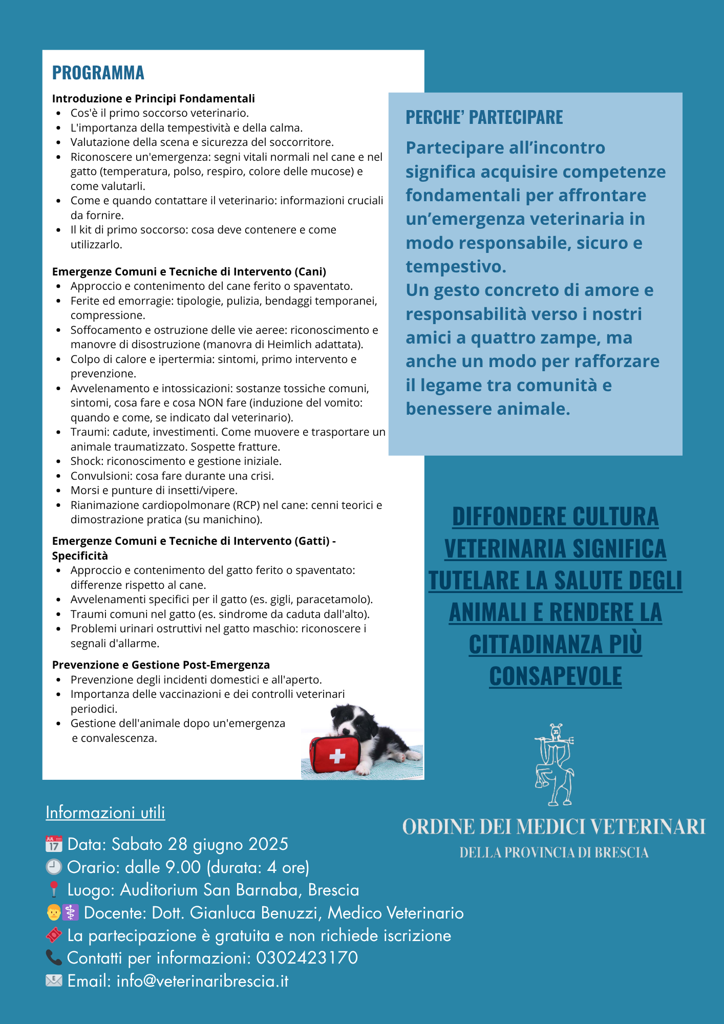 L’Ordine dei Medici Veterinari della provincia di Brescia, con il patrocinio del Comune di Brescia, promuove un percorso formativo gratuito rivolto a tutti i cittadini interessati a conoscere le principali manovre di primo soccorso per cani e gatti.